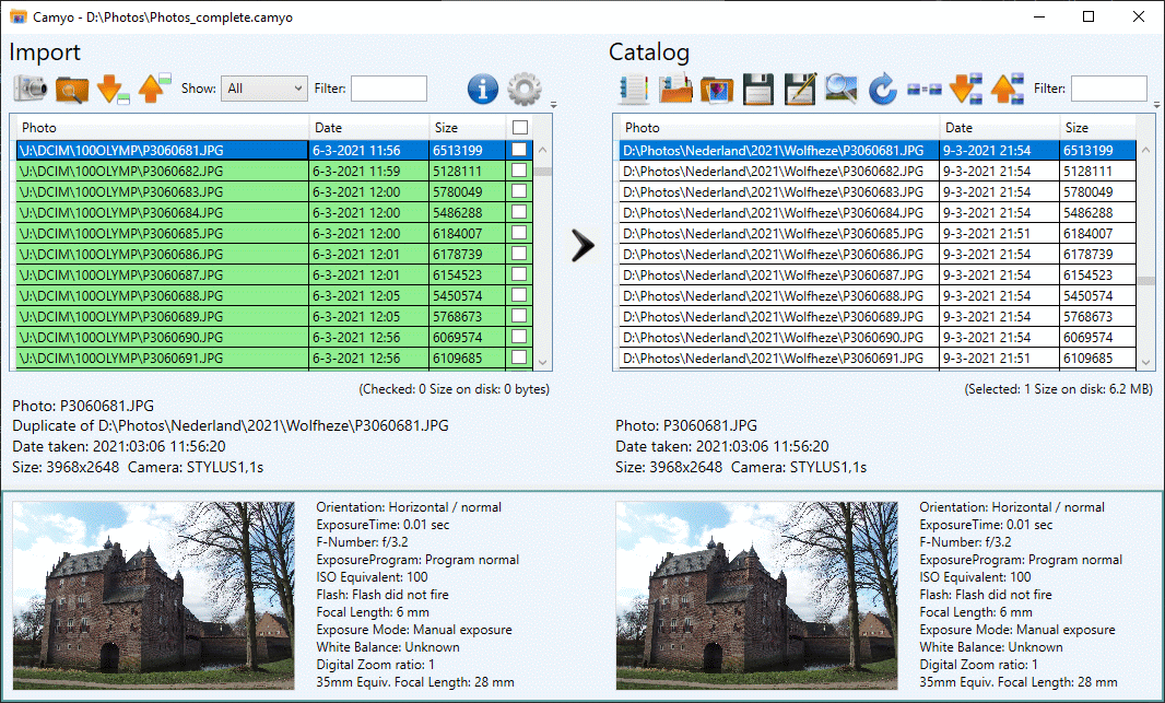 Camyo remembers the contents of your phone or camera, so when you connect it again, Camyo doesn’t need to create a fingerprint for any photos it has seen before. This makes it considerably faster to check your device for new items. For this feature, Camyo depends on the filename, file date and other metadata. So if any of these change a new fingerprint will be determined.