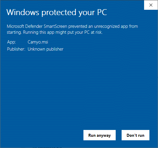 Click here to download the Camyo installer! (If nothing happens, right-click the link and then select ‘Open link in new tab’ in the pop-up menu). After the file Camyo.msi has been downloaded you can execute it. Usually, you will see the screen below when installing Camyo. Click on ‘More info‘.